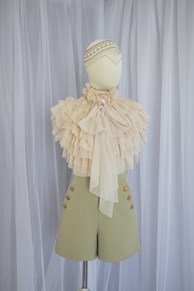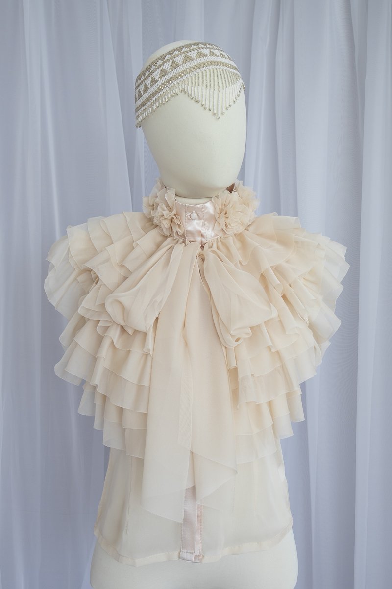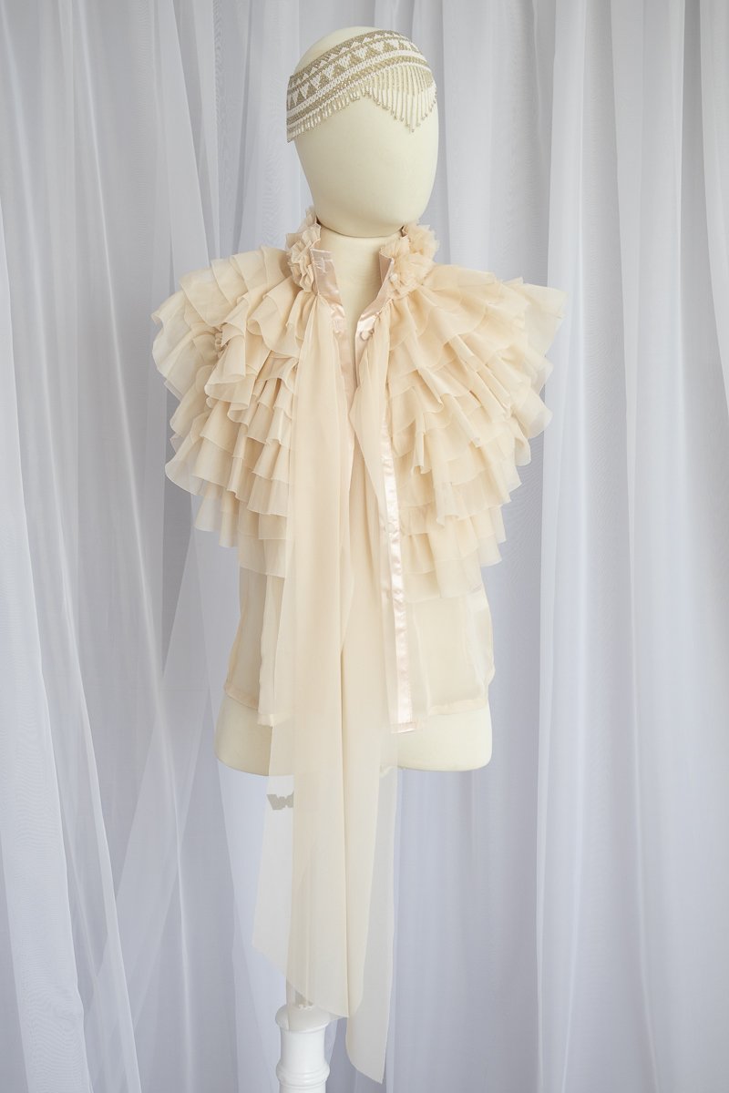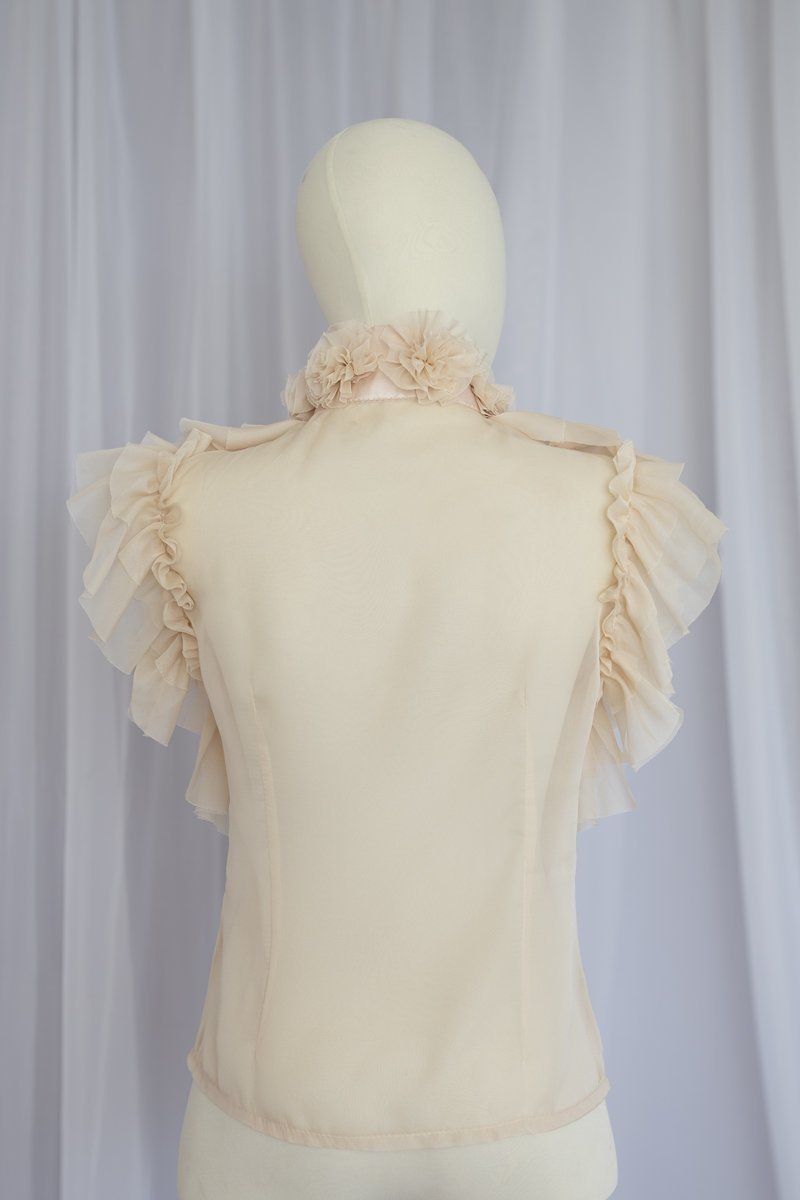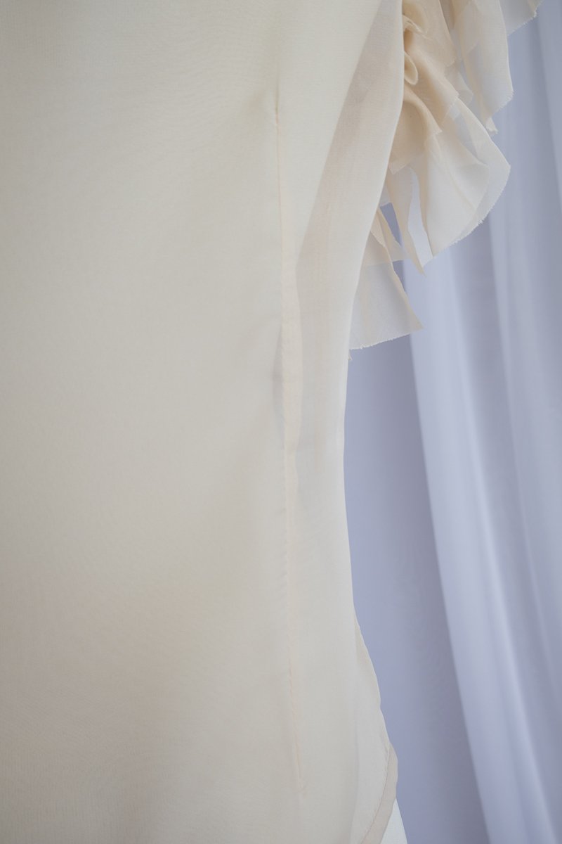 Su diseño traslúcido y fluido crea un efecto delicado y con aires boho, mientras que los olanes desde la cintura hacia arriba aportan volumen y presencia en la parte superior. La lazada en el cuello le da un aire sofisticado y versátil, perfecta para usarla con un moño o suelta y un tanto desabotonada para un look más relajado.