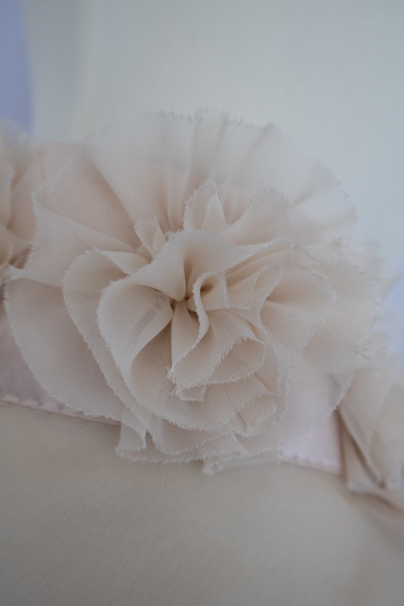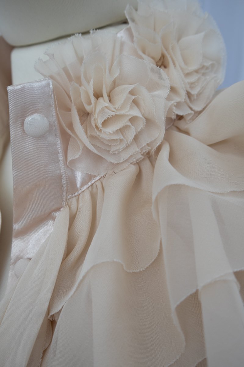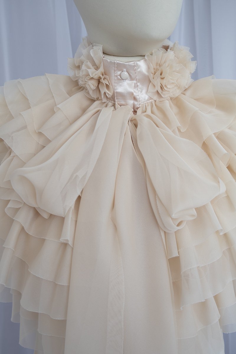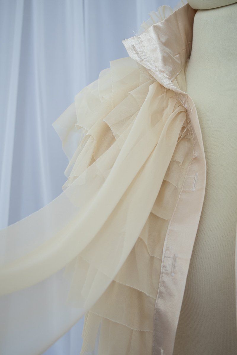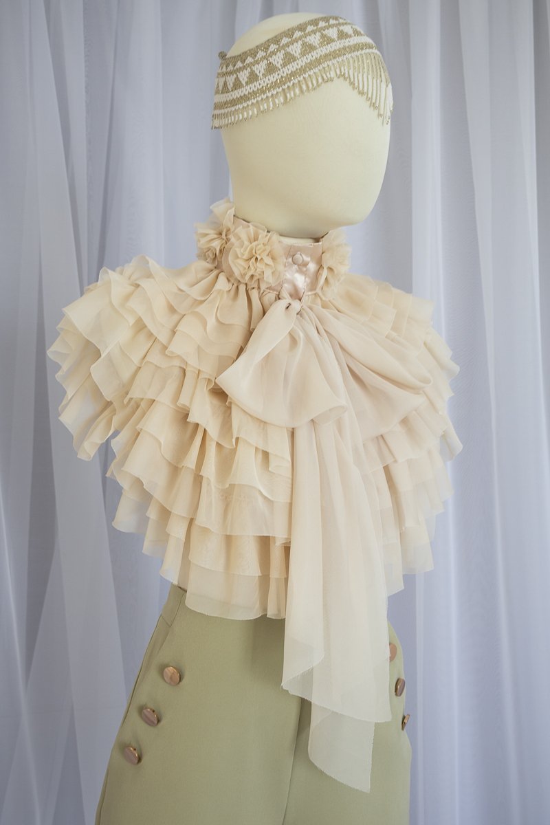 Su diseño traslúcido y fluido crea un efecto delicado y con aires boho, mientras que los olanes desde la cintura hacia arriba aportan volumen y presencia en la parte superior. La lazada en el cuello le da un aire sofisticado y versátil, perfecta para usarla con un moño o suelta y un tanto desabotonada para un look más relajado.