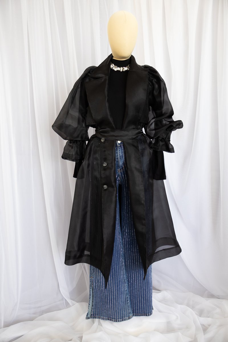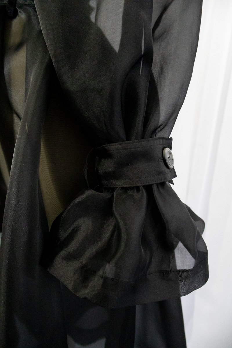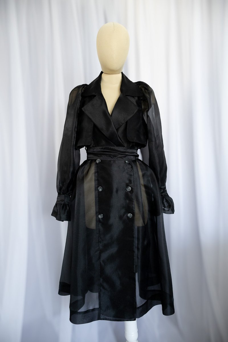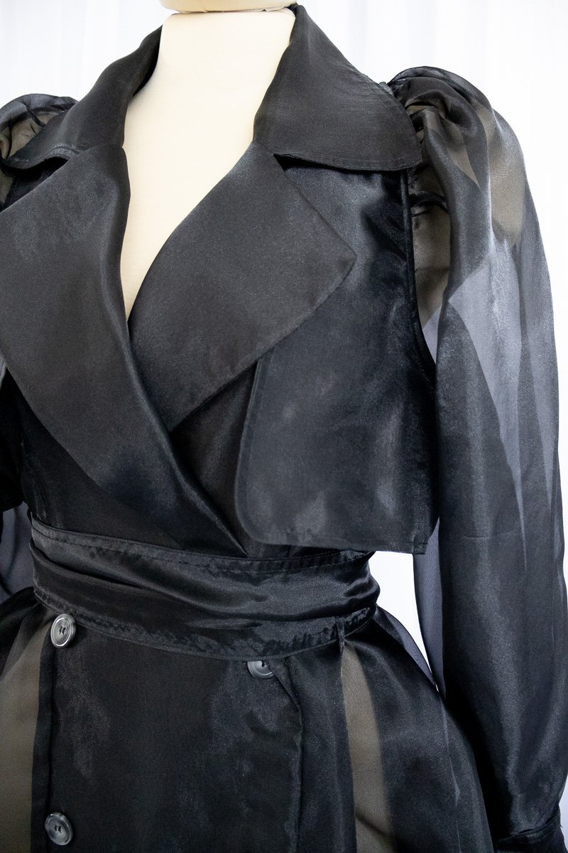Gabardina negra traslúcida en organza que juega con volúmenes y siluetas. Tiene mangas abullonadas, escote en V, corte princesa y cinturón para definir la cintura.