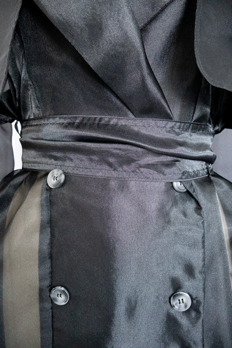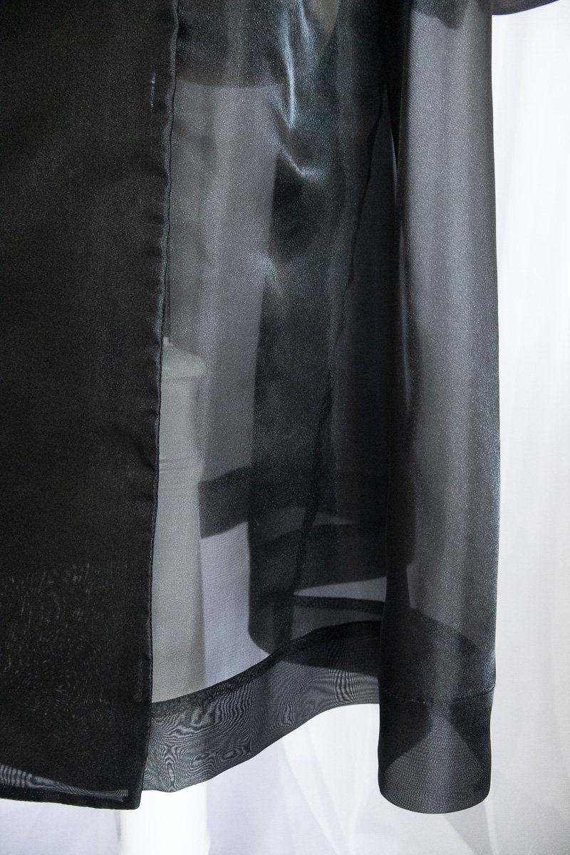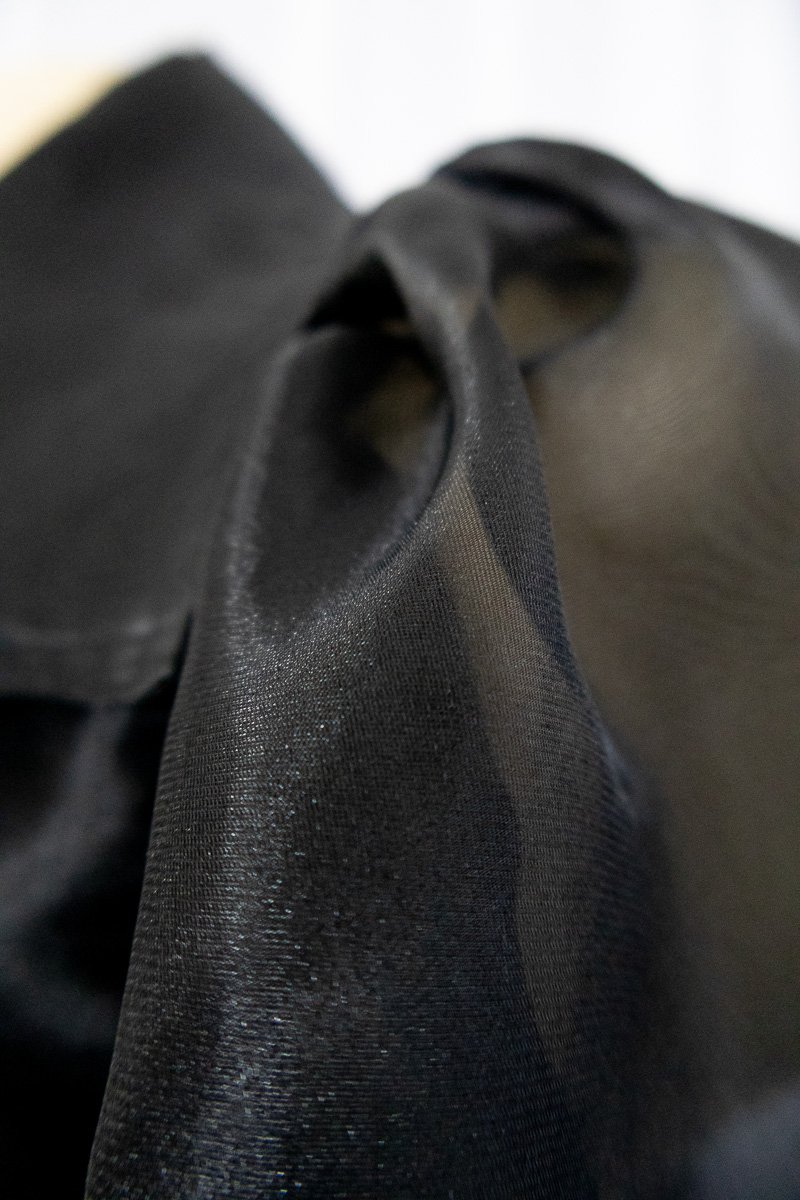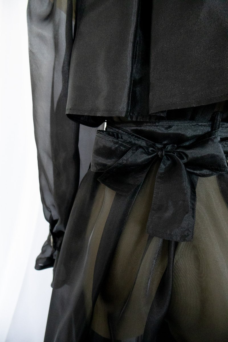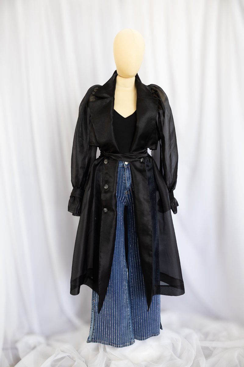 Gabardina negra traslúcida en organza que juega con volúmenes y siluetas. Tiene mangas abullonadas, escote en V, corte princesa y cinturón para definir la cintura.