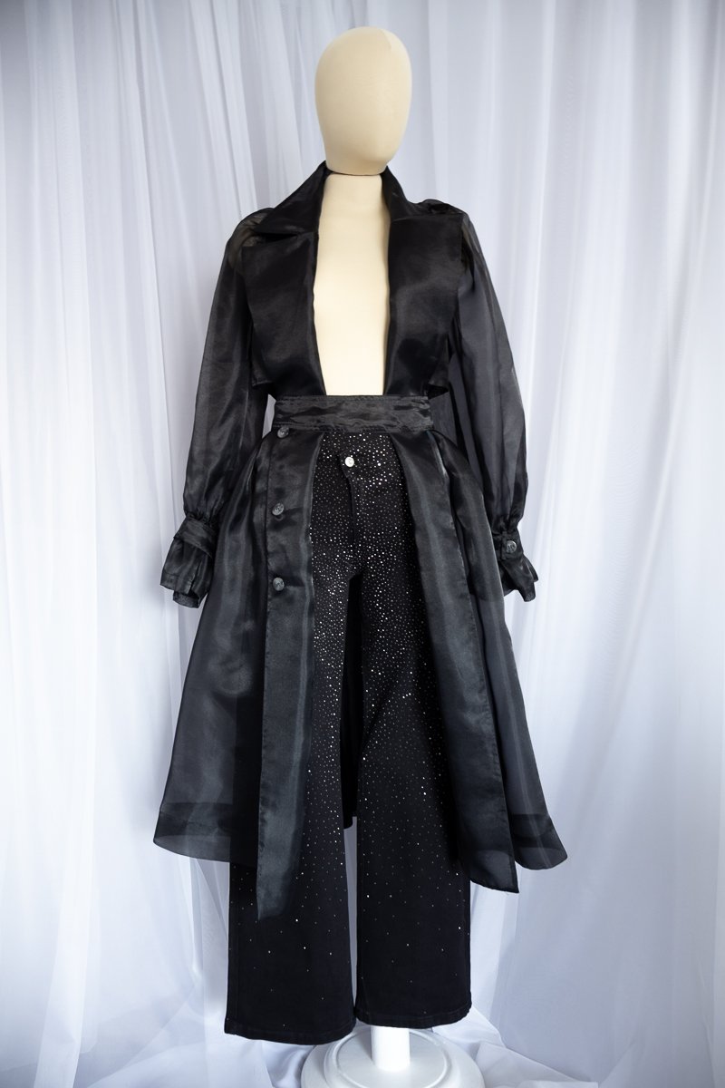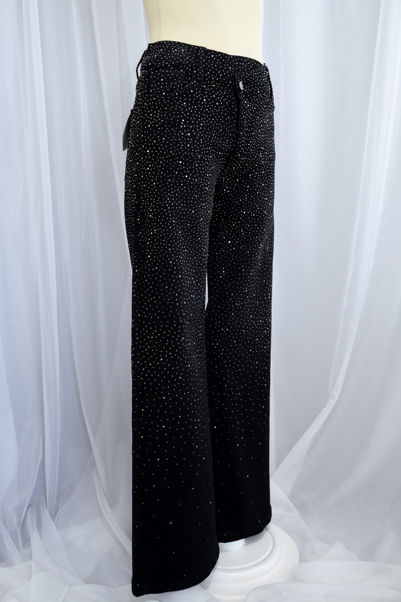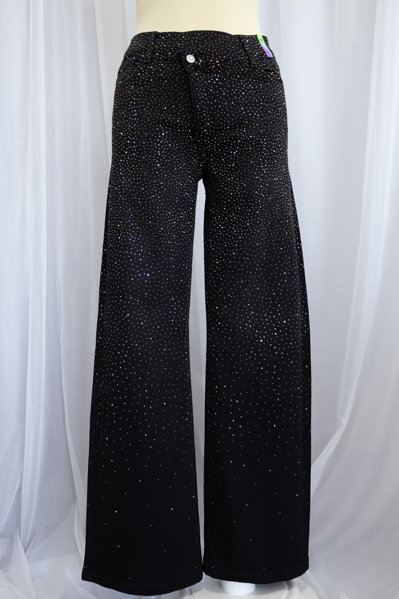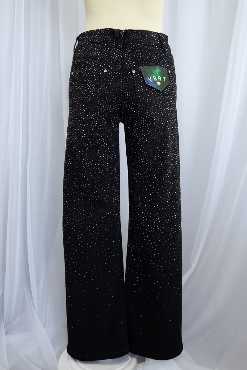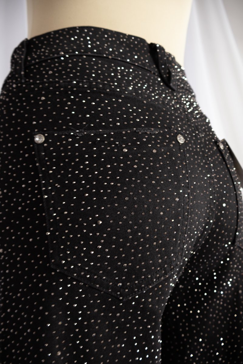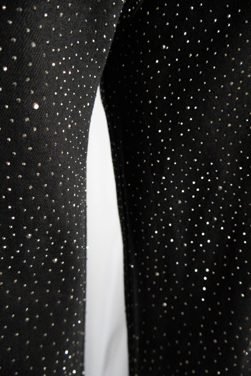 Pantalón de mezclilla negra cubierto de cristales grises que capturan la luz en cada movimiento. De pierna recta, tiro medio y cintura en V, diseñada para crear el efecto visual de una cintura más pequeña. ✨La mezclilla es gruesa, con stretch muy ligero, lo que aporta estructura sin perder comodidad.